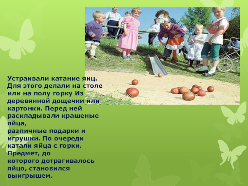 Устраивали катание яиц. Для этого делали на столе или на полу горку Издеревянной дощечки или картонки. Перед