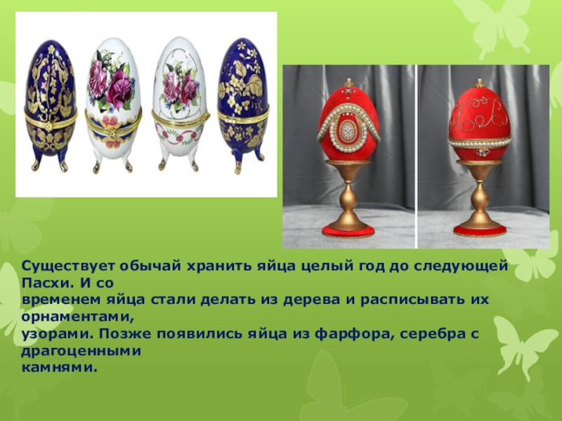 узорами. Позже появились яйца из фарфора, серебра с драгоценными
