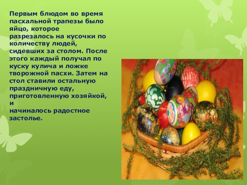 Слайд 6Первым блюдом во время пасхальной трапезы было яйцо, которое