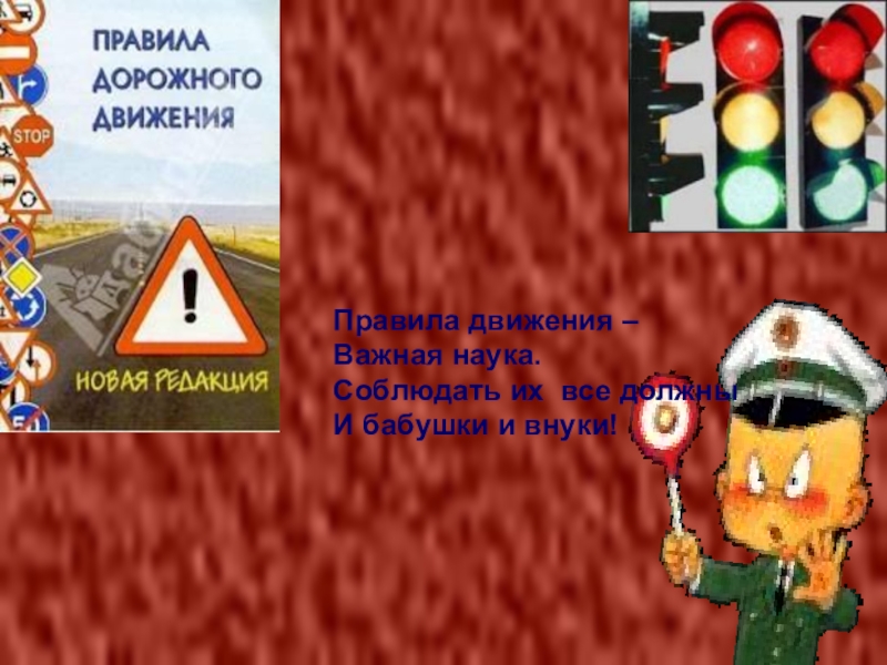 Правила движения –Важная наука.Соблюдать их все должныИ бабушки и внуки!