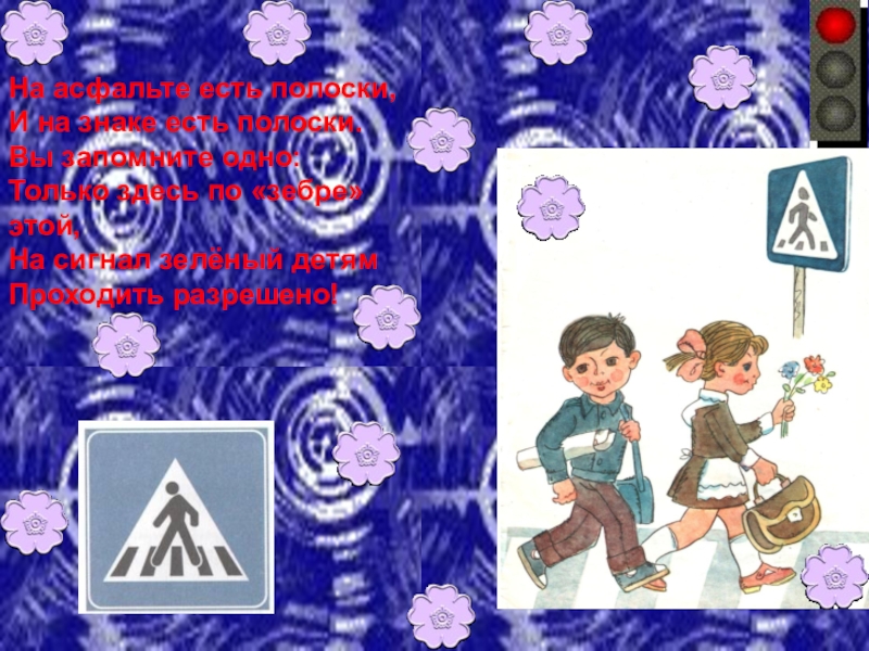 На асфальте есть полоски,И на знаке есть полоски.Вы запомните одно:Только здесь по «зебре» этой,На сигнал зелёный детямПроходить
