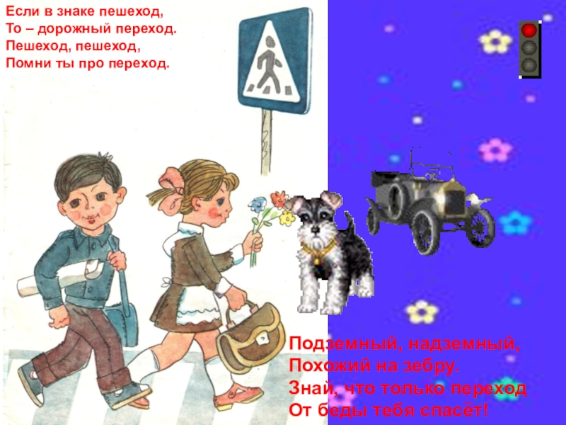 Подземный, надземный,Похожий на зебру.Знай, что только переходОт беды тебя спасёт!Если в знаке пешеход,То – дорожный переход.Пешеход, пешеход,Помни