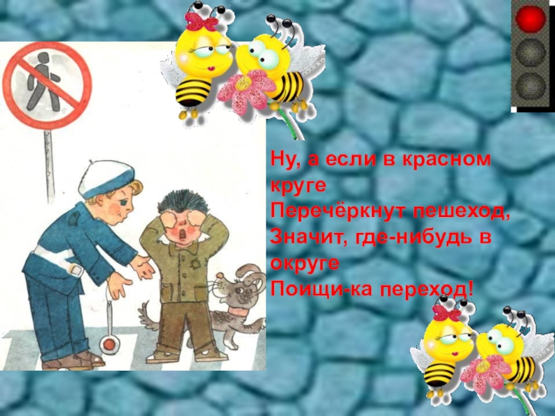 Ну, а если в красном кругеПеречёркнут пешеход,Значит, где-нибудь в округеПоищи-ка переход!