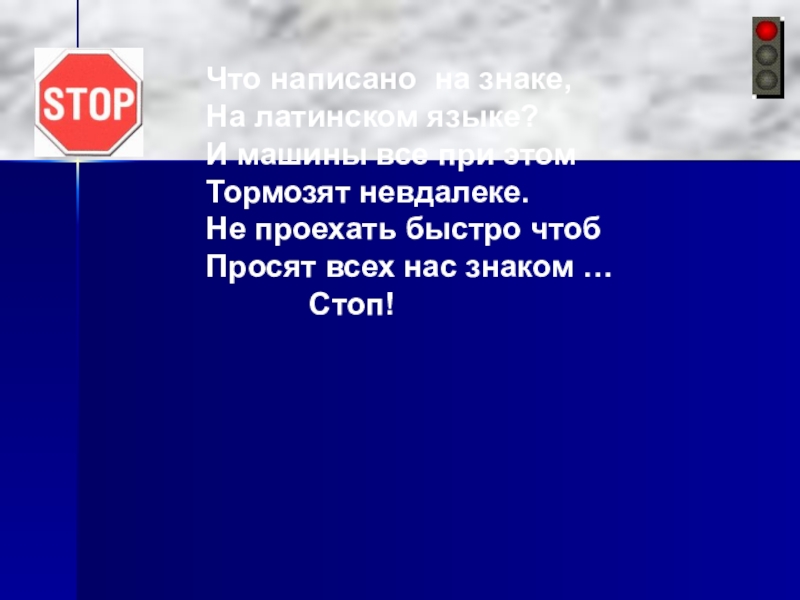 Что написано на знаке,На латинском языке?И машины все при этомТормозят невдалеке.Не проехать быстро чтобПросят всех нас знаком