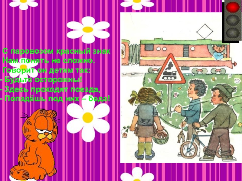 С паровозом красный знакНам понять не сложно.Говорит он детям так: Будьте осторожны! Здесь проходят поезда, Попадёшь под