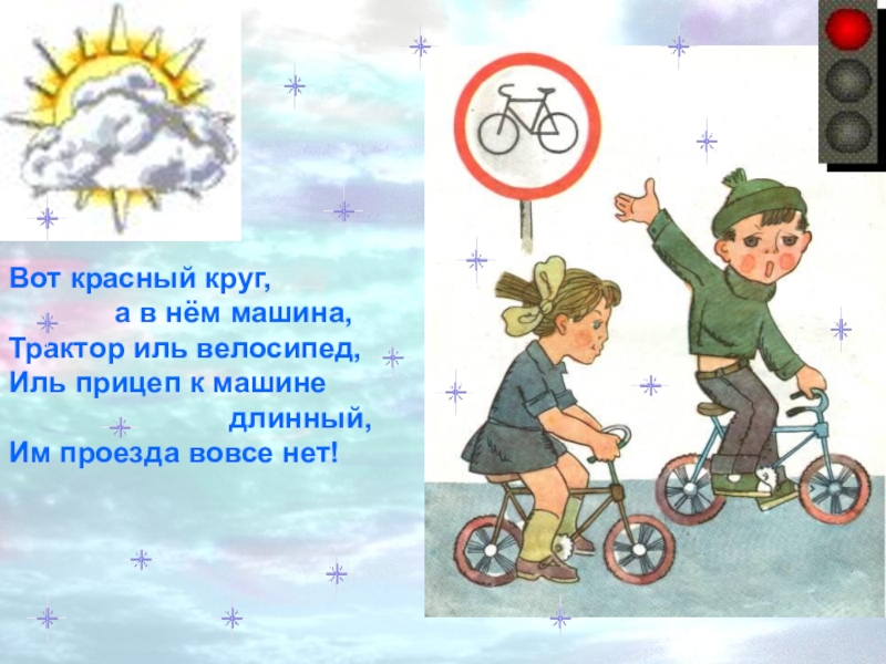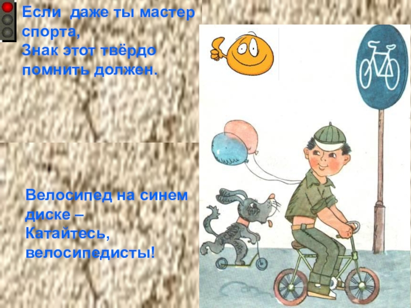 Если даже ты мастер спорта,Знак этот твёрдо помнить должен.Велосипед на синем диске –Катайтесь, велосипедисты!