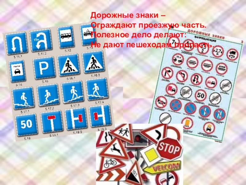 Дорожные знаки –Ограждают проезжую часть.Полезное дело делают:Не дают пешеходам пропасть.