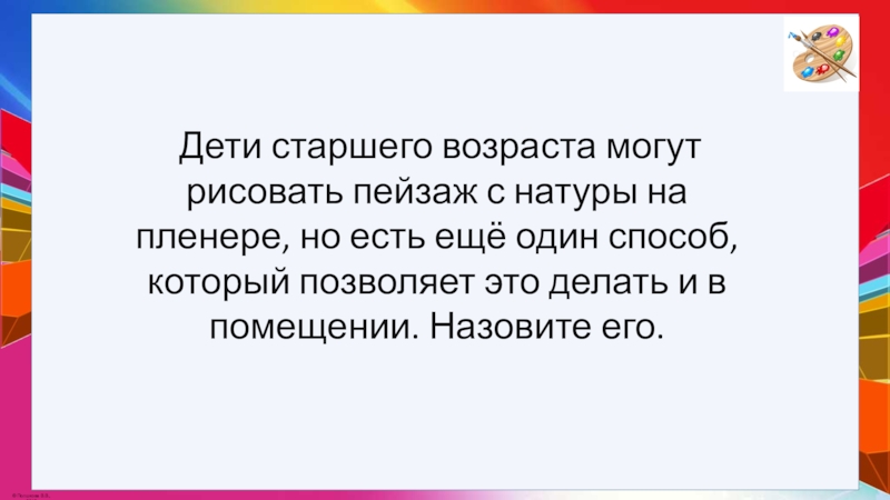 Слайд 25Дети старшего возраста могут рисовать пейзаж с натуры на пленере, но