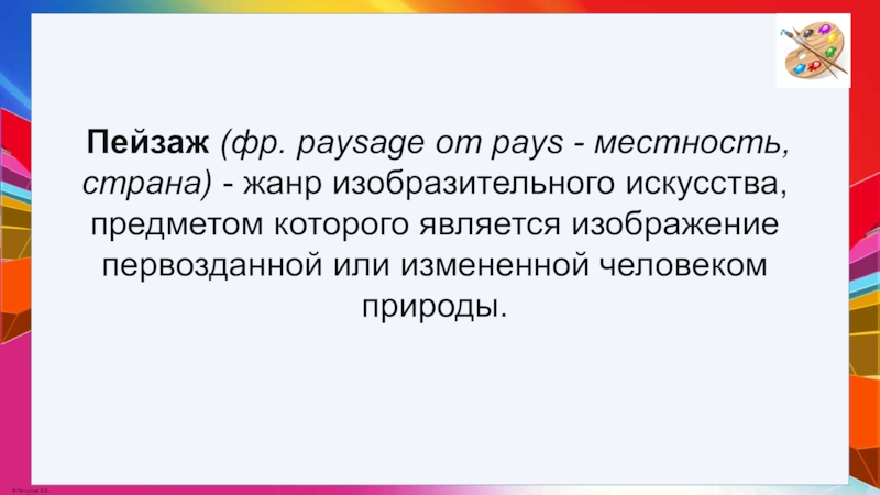 Слайд 4Пейзаж (фр. рaysage от рays - местность, страна) - жанр изобразительного искусства, предметом