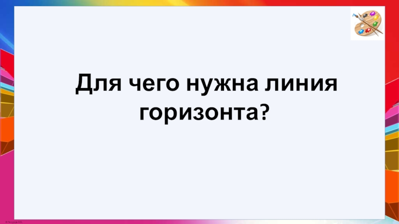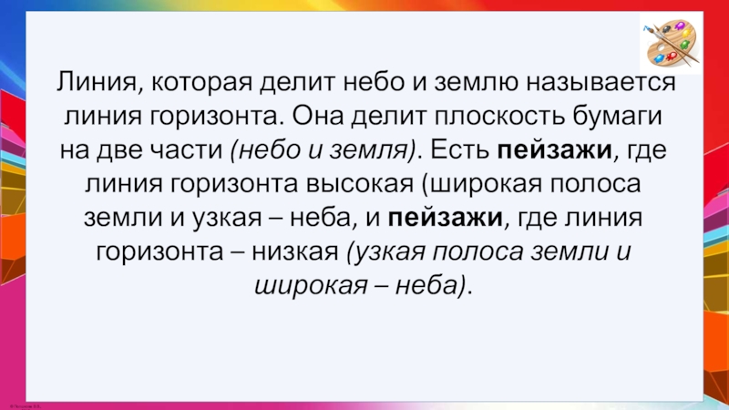 плоскость бумаги на две части (небо и земля). Есть пейзажи, где линия горизонта высокая (широкая полоса земли и узкая – неба, и пейзажи, где линия горизонта – низкая (узкая полоса земли и широкая – неба).