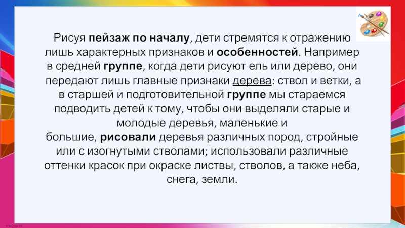 Слайд 30Рисуя пейзаж по началу, дети стремятся к отражению лишь характерных признаков и особенностей.