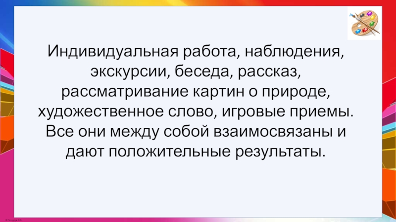 Слайд 14Индивидуальная работа, наблюдения, экскурсии, беседа, рассказ, рассматривание картин о природе, художественное