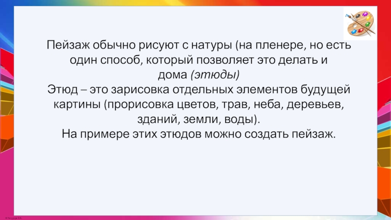 Слайд 8Этюд – это зарисовка отдельных элементов будущей картины (прорисовка цветов, трав, неба, деревьев,