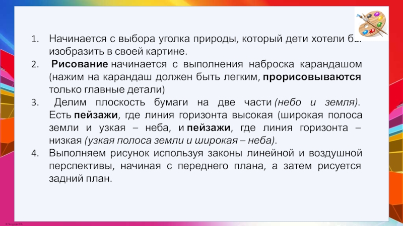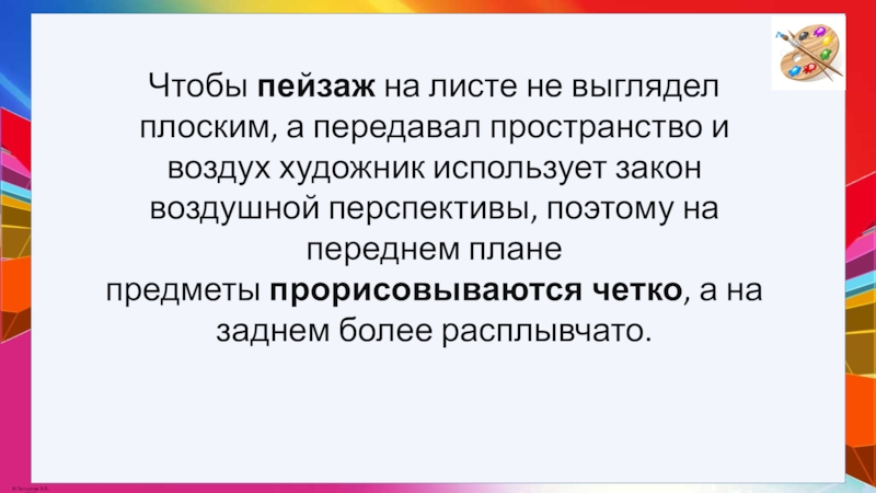 Слайд 28Чтобы пейзаж на листе не выглядел плоским, а передавал пространство и воздух художник