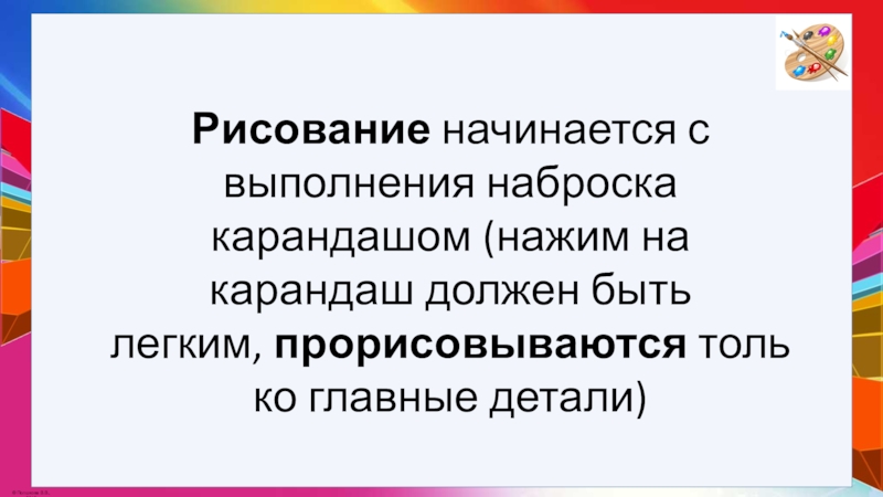 Слайд 10Рисование начинается с выполнения наброска карандашом (нажим на карандаш должен быть легким, прорисовываются только