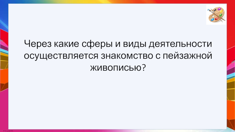 Слайд 19Через какие сферы и виды деятельности осуществляется знакомство с пейзажной живописью?