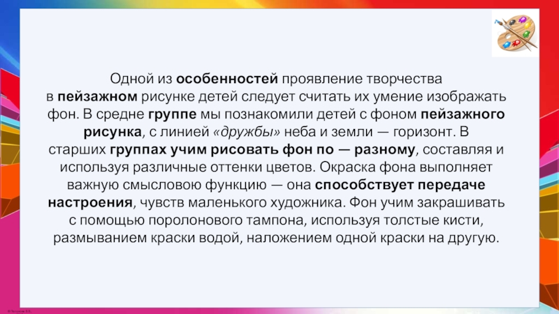 Слайд 22Одной из особенностей проявление творчества в пейзажном рисунке детей следует считать их умение изображать фон.