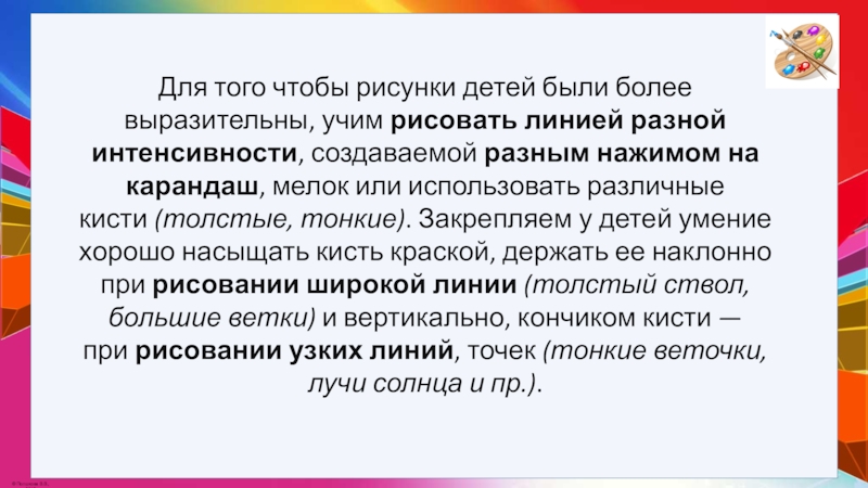 Слайд 18Для того чтобы рисунки детей были более выразительны, учим рисовать линией разной