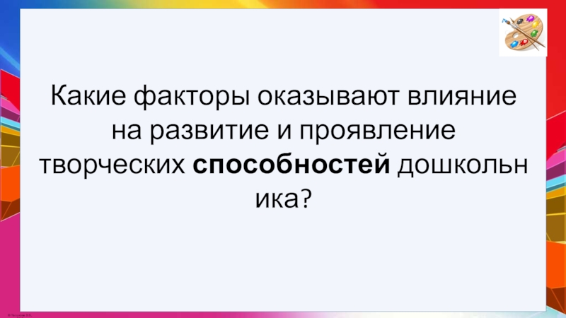 Слайд 5Какие факторы оказывают влияние на развитие и проявление творческих способностей дошкольника?