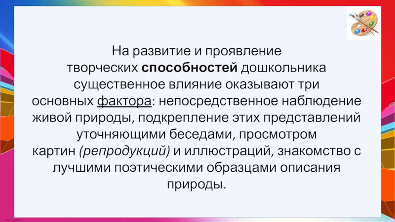 Слайд 6На развитие и проявление творческих способностей дошкольника существенное влияние оказывают три основных фактора: непосредственное