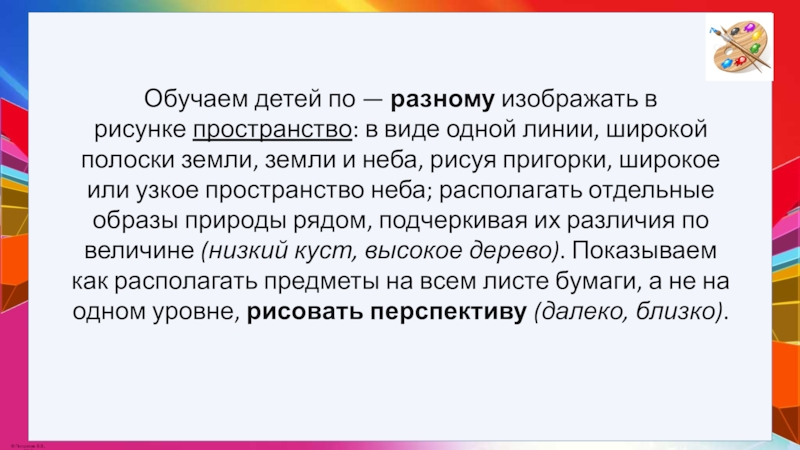 полоски земли, земли и неба, рисуя пригорки, широкое или узкое пространство неба; располагать отдельные образы природы рядом, подчеркивая их различия по величине (низкий куст, высокое дерево). Показываем как располагать предметы на всем листе бумаги, а не на одном уровне, рисовать перспективу (далеко, близко).