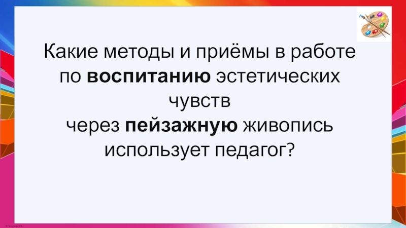 Слайд 13Какие методы и приёмы в работе по воспитанию эстетических чувств через пейзажную живопись использует педагог?