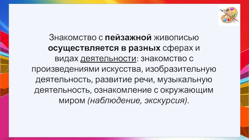 Слайд 20Знакомство с пейзажной живописью осуществляется в разных сферах и видах деятельности: знакомство с произведениями искусства,