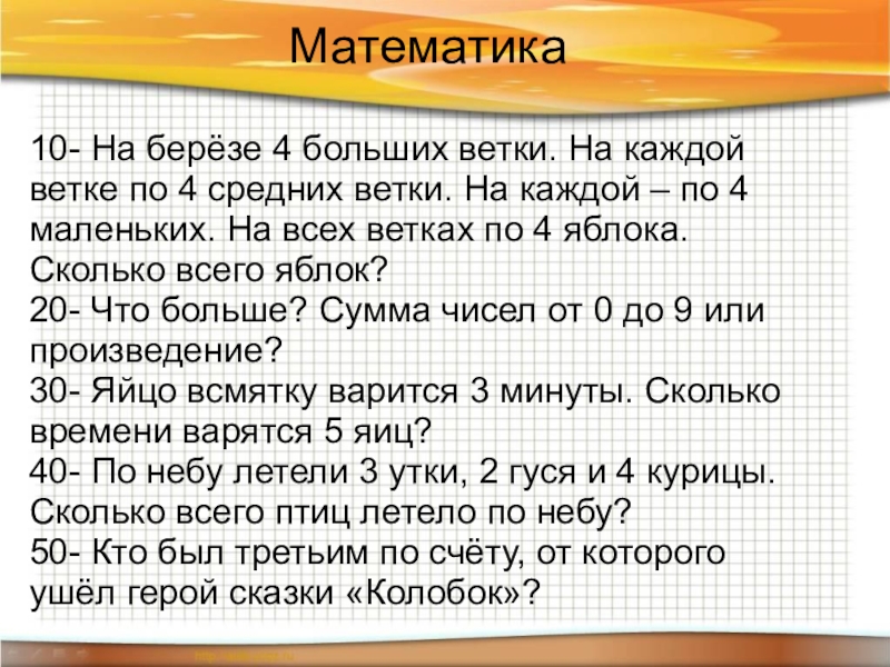 10- На берёзе 4 больших ветки. На каждой ветке по 4 средних ветки. На каждой – по 4 маленьких. На всех ветках по 4 яблока. Сколько всего яблок?