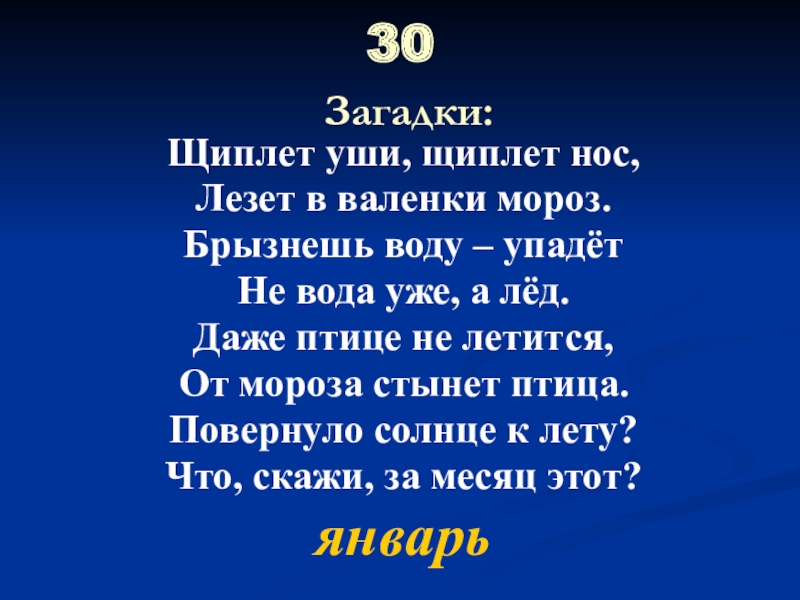 30  Загадки:Щиплет уши, щиплет нос,Лезет в валенки мороз.Брызнешь воду – упадётНе вода уже, а лёд.Даже птице