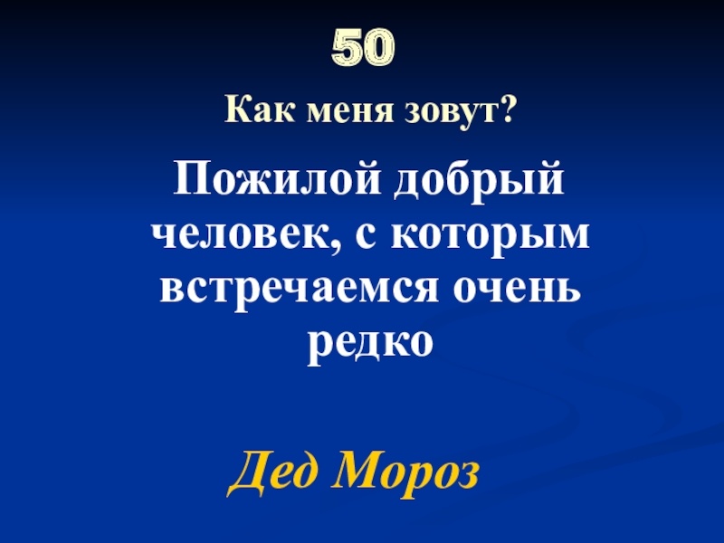50  Как меня зовут? Пожилой добрый человек, с которым встречаемся очень редкоДед Мороз