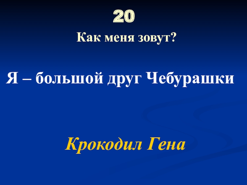 20  Как меня зовут?Я – большой друг ЧебурашкиКрокодил Гена