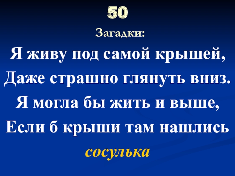 50  Загадки:Я живу под самой крышей,Даже страшно глянуть вниз.Я могла бы жить и выше,Если б крыши