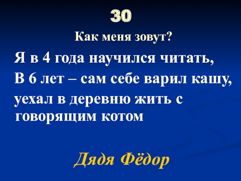 30  Как меня зовут? Я в 4 года научился читать, В 6 лет – сам себе