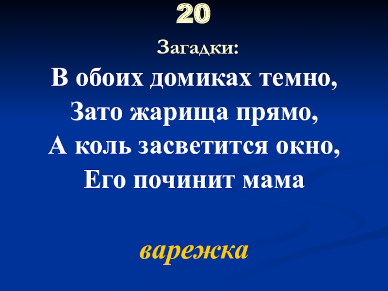 20  Загадки:В обоих домиках темно,Зато жарища прямо,А коль засветится окно,Его починит мамаварежка