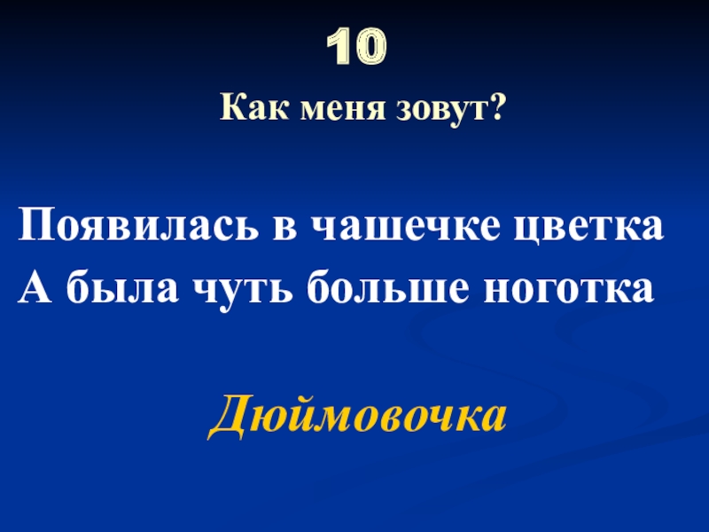 10  Как меня зовут?Появилась в чашечке цветкаА была чуть больше ноготкаДюймовочка