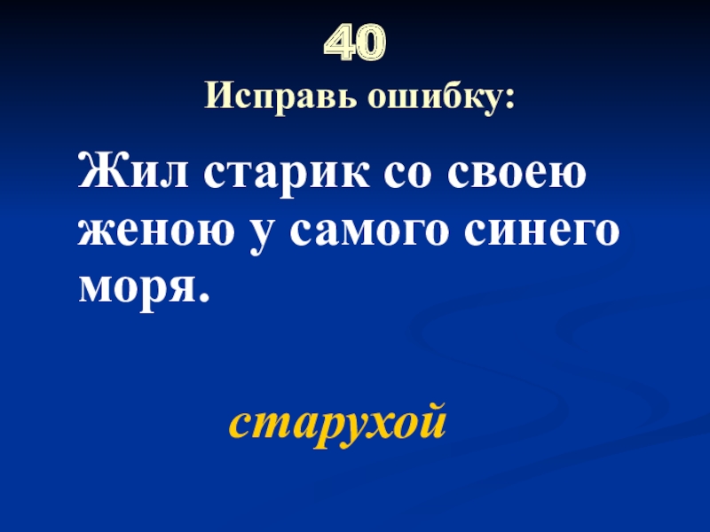 40  Исправь ошибку: Жил старик со своею женою у самого синего моря.старухой