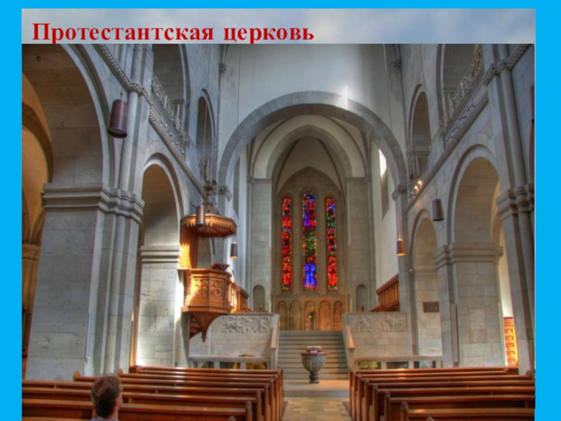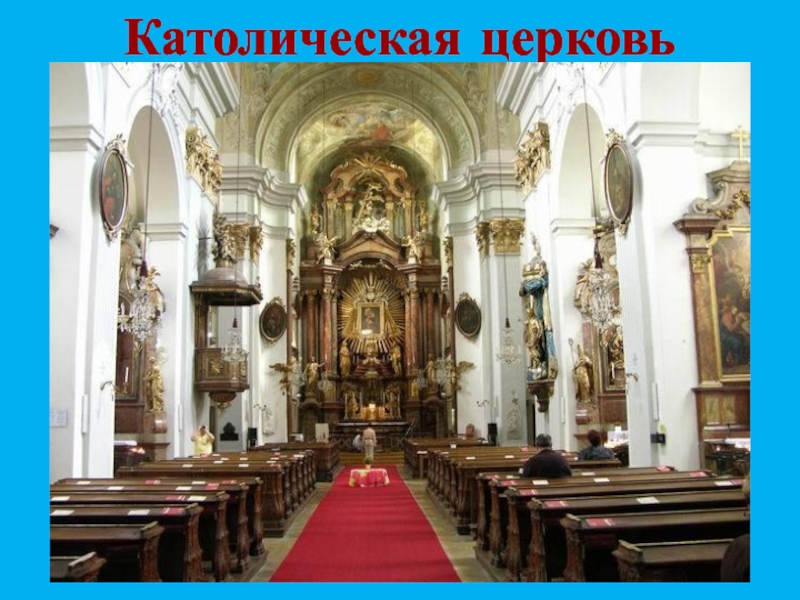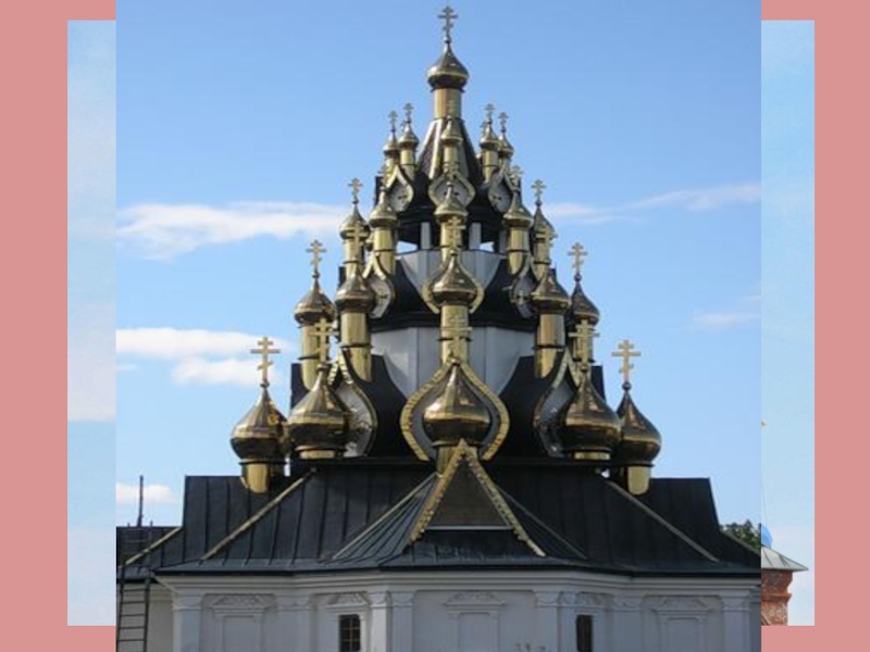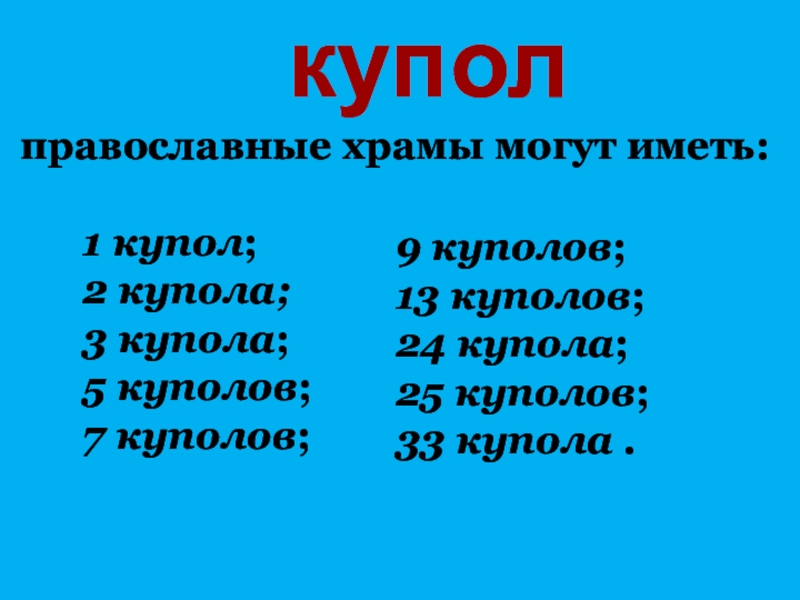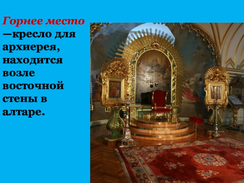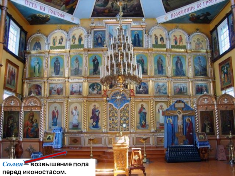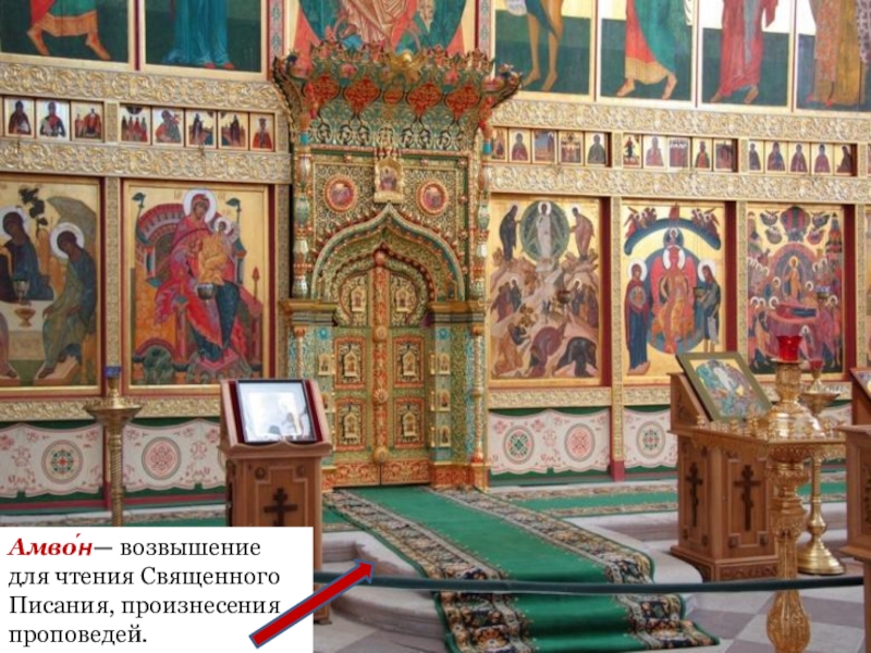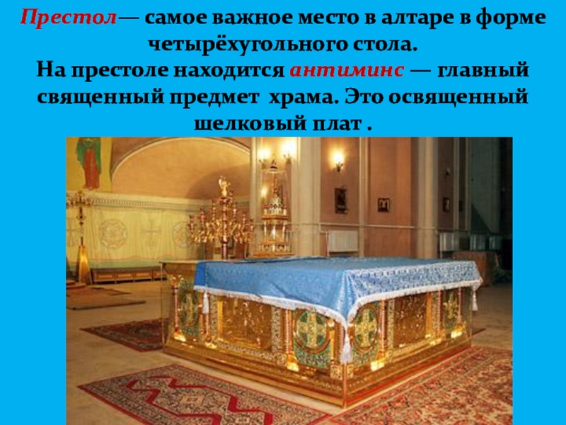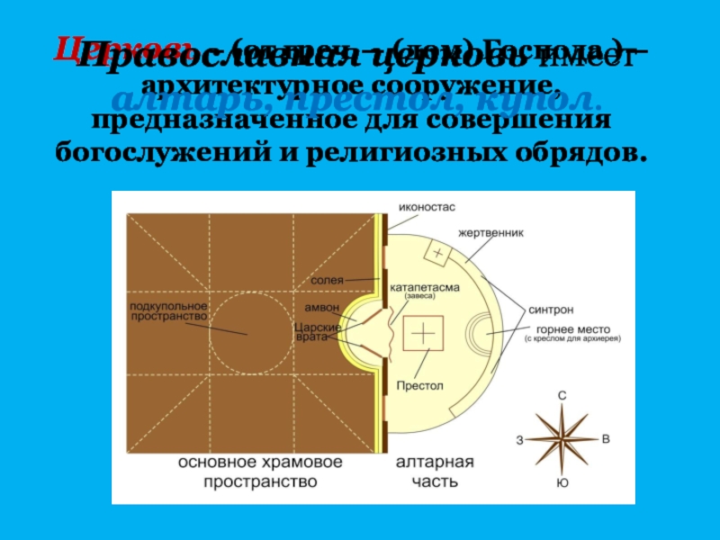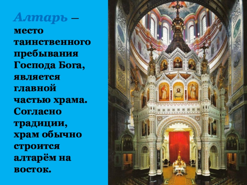 Православная церковь имеет алтарь, престол, купол.