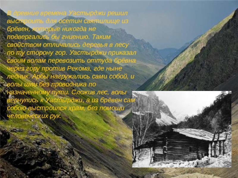 Слайд 5В древние времена Уастырджи решил выстроить для осетин святилище из брёвен,
