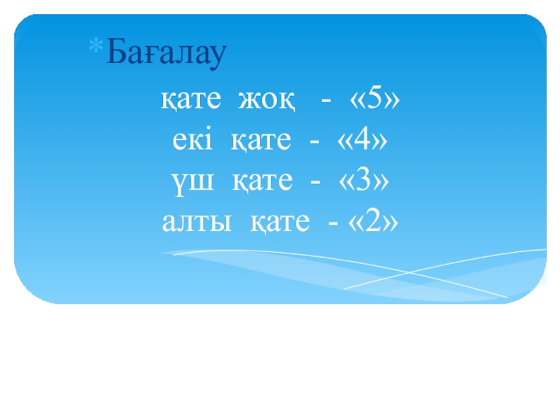 қате жоқ  - «5» екі қате - «4»  үш қате - «3» алты қате -