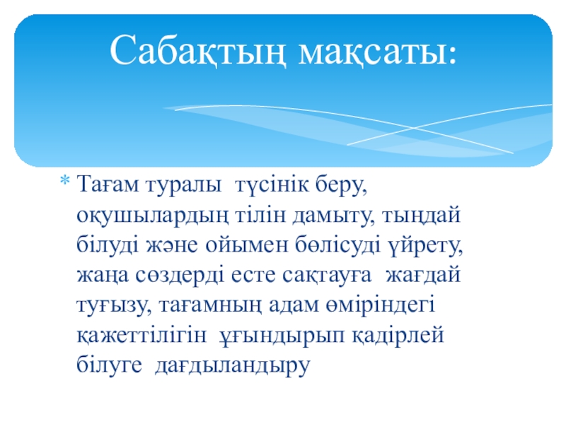 Слайд 2Тағам туралы түсінік беру, оқушылардың тілін дамыту, тыңдай білуді және ойымен