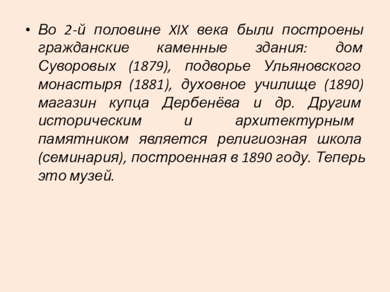 Суворовых (1879), подворье Ульяновского монастыря (1881), духовное училище (1890) магазин купца Дербенёва и др. Другим историческим и архитектурным памятником является религиозная школа (семинария), построенная в 1890 году. Теперь это музей.