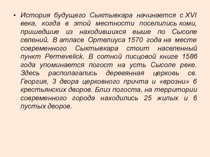 пришедшие из находившихся выше по Сысоле селений. В атласе Ортелиуса 1570 года на месте современного Сыктывкара стоит населенный пункт Permevelick. В сотной писцовой книге 1586 года упоминается погост на усть Сысоле реке. Здесь располагались деревянная церковь св. Георгия, 3 двора церковного причта и «врозни» 6 крестьянских дворов. Близ погоста, на территории современного города находились 25 жилых и 6 пустых дворов.