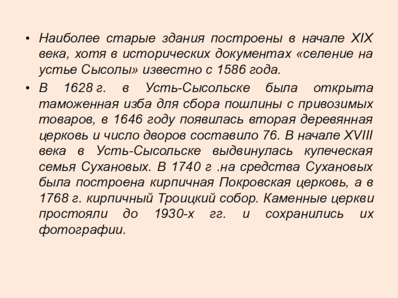 В 1628 г. в Усть-Сысольске была открыта таможенная изба для сбора пошлины с привозимых товаров, в 1646 году появилась вторая деревянная церковь и число дворов составило 76. В начале XVIII века в Усть-Сысольске выдвинулась купеческая семья Сухановых. В 1740 г .на средства Сухановых была построена кирпичная Покровская церковь, а в 1768 г. кирпичный Троицкий собор. Каменные церкви простояли до 1930-х гг. и сохранились их фотографии.