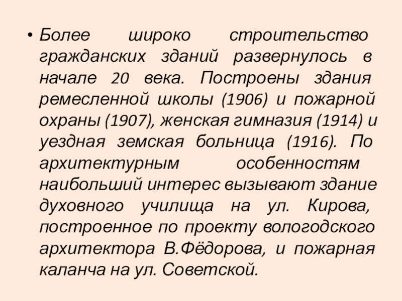 здания ремесленной школы (1906) и пожарной охраны (1907), женская гимназия (1914) и уездная земская больница (1916). По архитектурным особенностям наибольший интерес вызывают здание духовного училища на ул. Кирова, построенное по проекту вологодского архитектора В.Фёдорова, и пожарная каланча на ул. Советской.