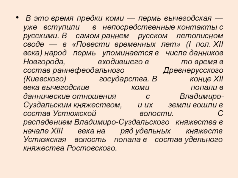 непосредственные контакты с русскими. В самом раннем русском летописном своде — в «Повести временных лет» (I пол. XII века) народ пермь упоминается в числе данников Новгорода, входившего в то время в состав раннефеодального Древнерусского (Киевского) государства. В конце XII века вычегодские коми попали в даннические отношения с Владимиро-Суздальским княжеством, и их земли вошли в состав Устюжской волости. С распадением Владимиро-Суздальского княжества в начале XIII века на ряд удельных княжеств Устюжская волость попала в состав удельного княжества Ростовского.