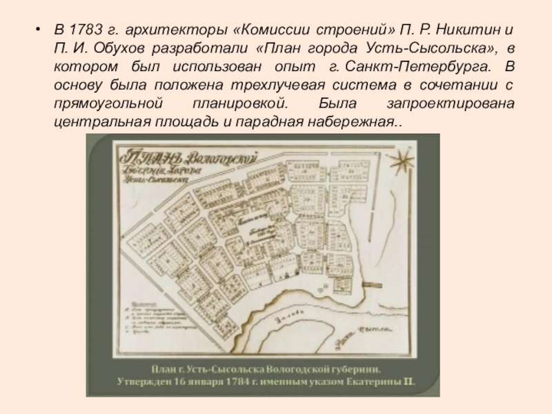 Слайд 14В 1783 г. архитекторы «Комиссии строений» П. Р. Никитин и П. И. Обухов разработали «План города Усть-Сысольска», в