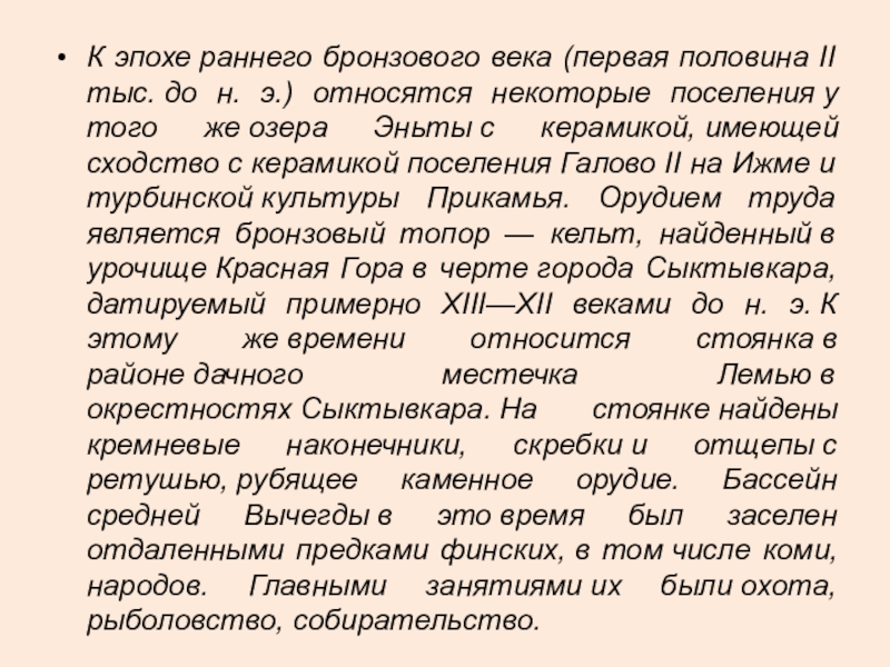 некоторые поселения у того же озера Эньты с керамикой, имеющей сходство с керамикой поселения Галово II на Ижме и турбинской культуры Прикамья. Орудием труда является бронзовый топор — кельт, найденный в урочище Красная Гора в черте города Сыктывкара, датируемый примерно XIII—XII веками до н. э. К этому же времени относится стоянка в районе дачного местечка Лемью в окрестностях Сыктывкара. На стоянке найдены кремневые наконечники, скребки и отщепы с ретушью, рубящее каменное орудие. Бассейн средней Вычегды в это время был заселен отдаленными предками финских, в том числе коми, народов. Главными занятиями их были охота, рыболовство, собирательство.