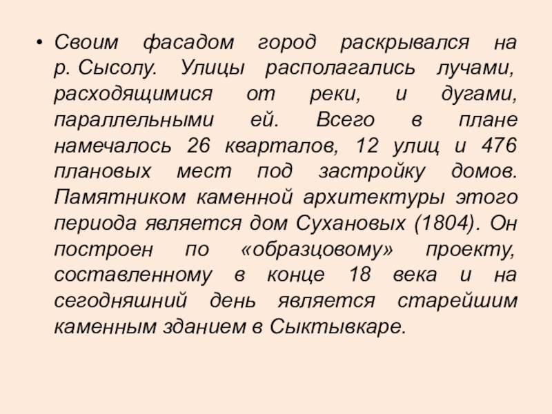 реки, и дугами, параллельными ей. Всего в плане намечалось 26 кварталов, 12 улиц и 476 плановых мест под застройку домов. Памятником каменной архитектуры этого периода является дом Сухановых (1804). Он построен по «образцовому» проекту, составленному в конце 18 века и на сегодняшний день является старейшим каменным зданием в Сыктывкаре.