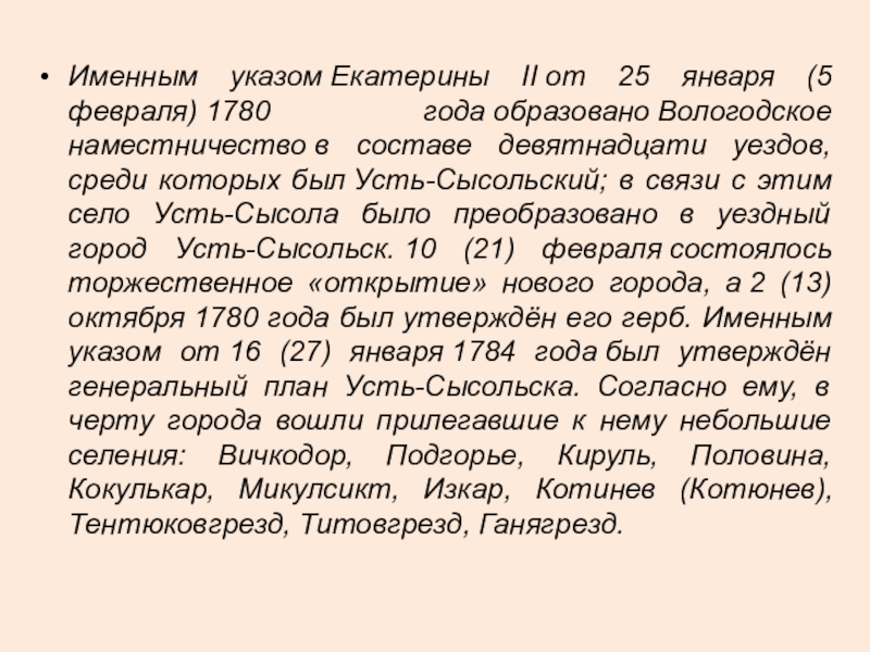 уездов, среди которых был Усть-Сысольский; в связи с этим село Усть-Сысола было преобразовано в уездный город Усть-Сысольск. 10 (21) февраля состоялось торжественное «открытие» нового города, а 2 (13) октября 1780 года был утверждён его герб. Именным указом от 16 (27) января 1784 года был утверждён генеральный план Усть-Сысольска. Согласно ему, в черту города вошли прилегавшие к нему небольшие селения: Вичкодор, Подгорье, Кируль, Половина, Кокулькар, Микулсикт, Изкар, Котинев (Котюнев), Тентюковгрезд, Титовгрезд, Ганягрезд.
