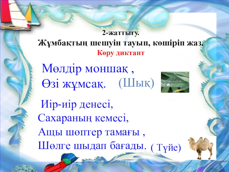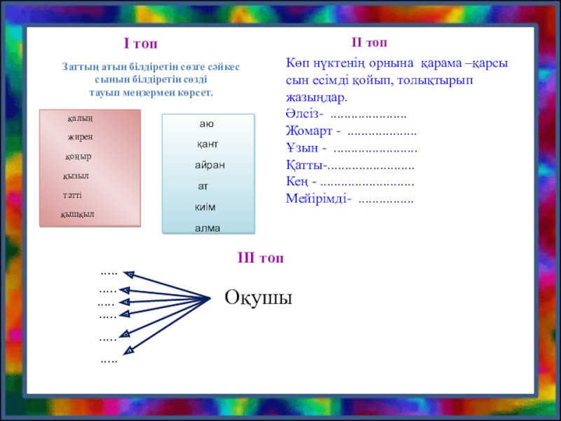 Көп нүктенің орнына қарама –қарсы сын есімді қойып, толықтырып жазыңдар.